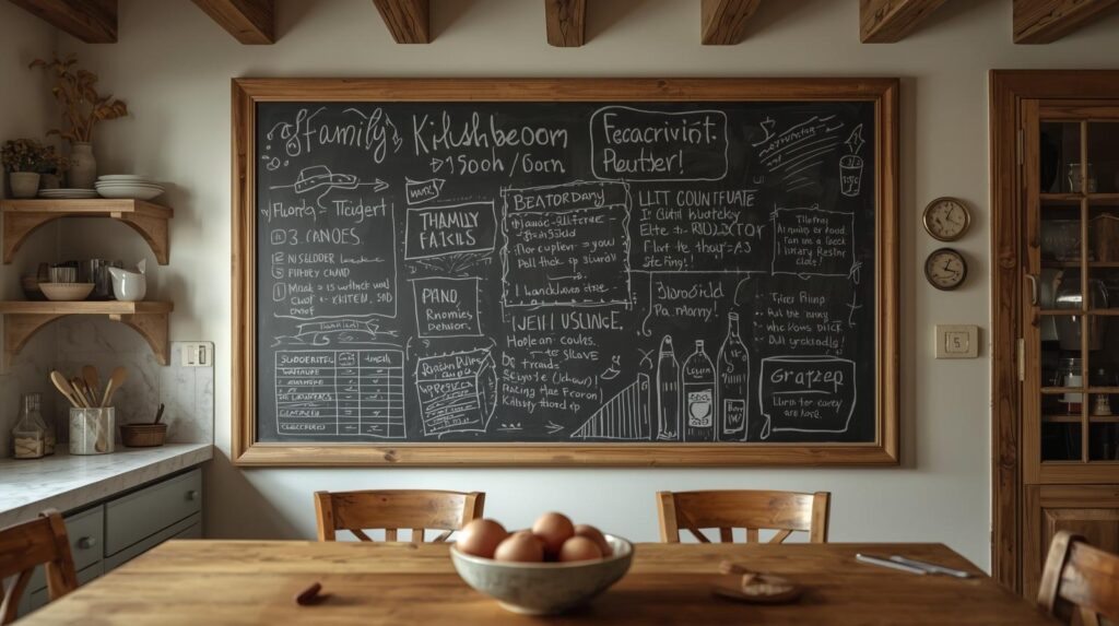 The kitchen chalkboard becomes the family’s information center, visible to everyone multiple times daily. Its central location ensures messages are seen, and its mutable nature allows constant updating as needs change.