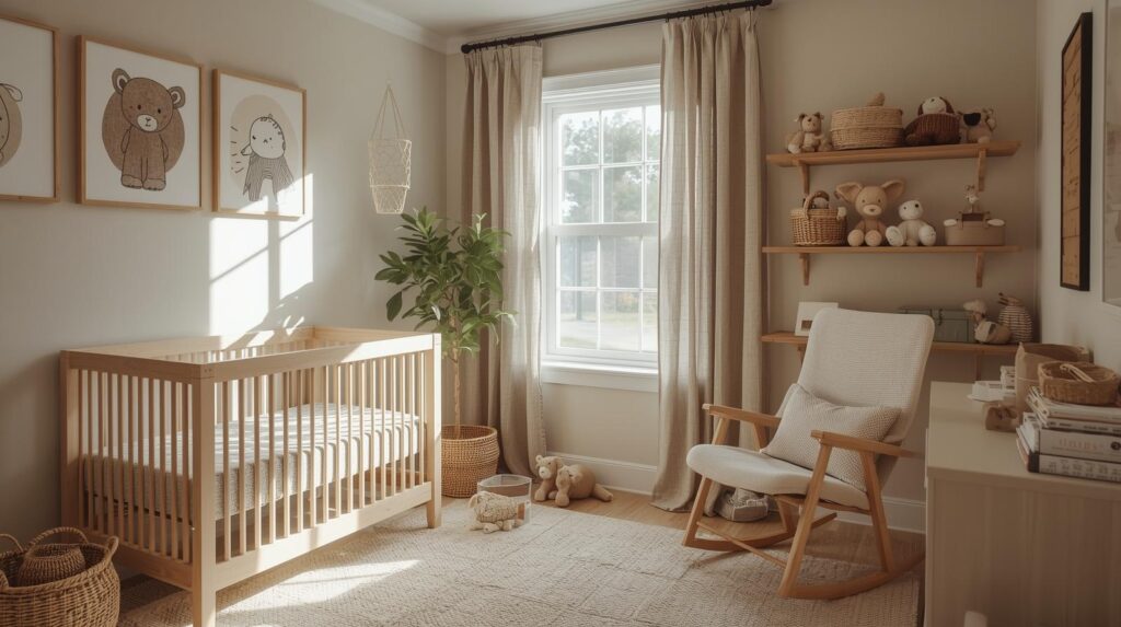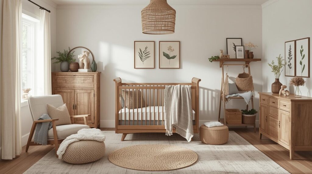 Natural materials like wood, wicker, and cotton have no gender associations, making them perfect for gender-neutral nurseries. A wood crib, wicker baskets, and cotton bedding create a warm, welcoming space without declaring the baby’s sex.