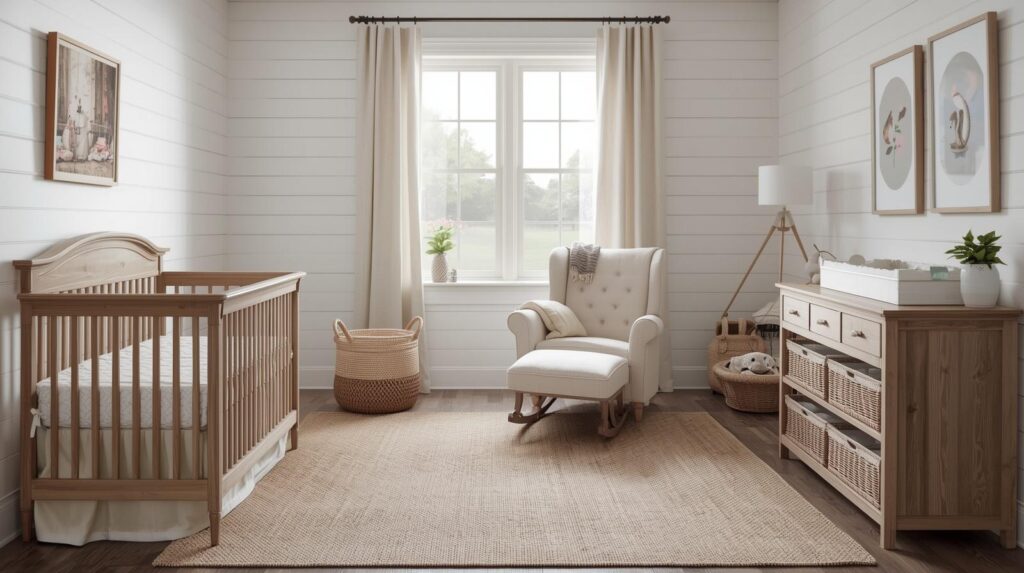 Shiplap, that hallmark of farmhouse style, adds texture and architectural interest to nurseries. White-painted shiplap creates a clean, fresh backdrop that feels both rustic and modern. Even a single shiplap accent wall behind the crib can transform the room’s character.