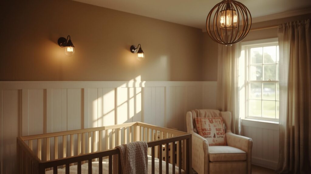 Lighting in a farmhouse nursery should be layered to accommodate different activities and times of day, with fixtures that contribute to the overall aesthetic.