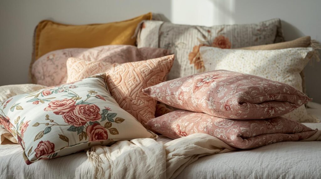 Texture adds depth and interest to a bed dressed with a floral comforter. A chunky knit throw draped across the foot, velvet pillows in coordinating colors, or a linen bed skirt all introduce tactile variety that makes the bed more inviting. These textural elements also provide opportunities to introduce additional colors from your comforter’s palette.