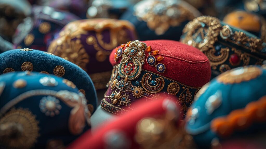 Also consider ceremony etiquette. Very tall or wide embellishments may block views behind you. Extremely reflective materials may create glare in photographs. Think about how your cap affects others’ experience.