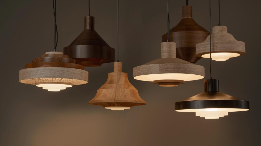 Wood brings warmth and organic texture to mid century pendants. Teak, rosewood, oak, and walnut appear in designs from Danish and Scandinavian makers. Molded plywood, shaped into compound curves, demonstrates the material’s expressive potential. Solid wood, whether turned on lathes or carved, adds handcrafted quality.