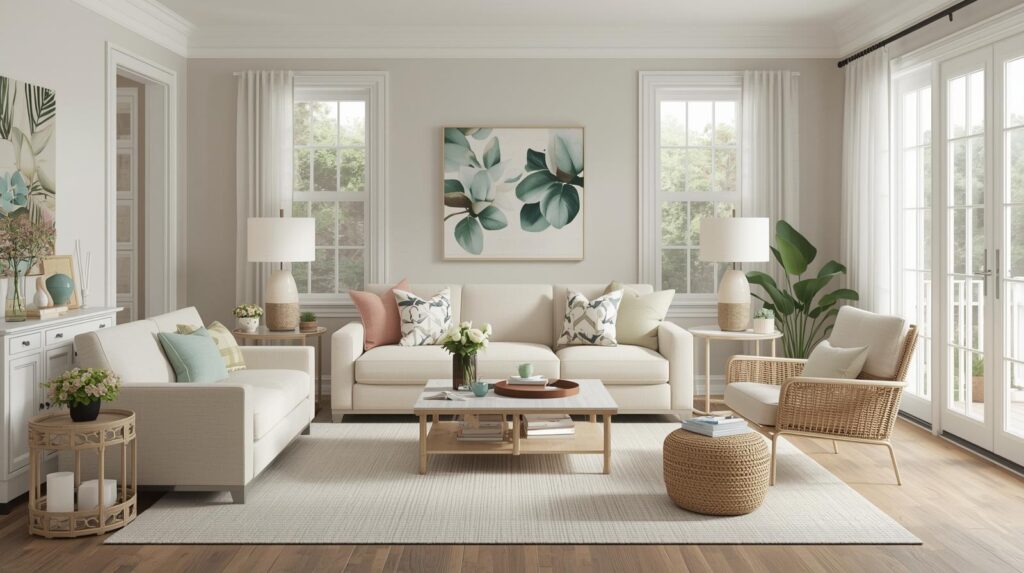 For those who prefer a more neutral foundation, spring offers opportunities to work with warm off-whites, creamy ivories, and soft greige tones that provide calm backdrops for other elements. In these schemes, color enters through accessories that can be easily changed as the season progresses or as tastes evolve. A neutral living room anchored by a cream sofa and linen curtains can be transformed with pastel pillows, a floral throw, and colorful artwork, allowing for flexibility and evolution throughout the season.